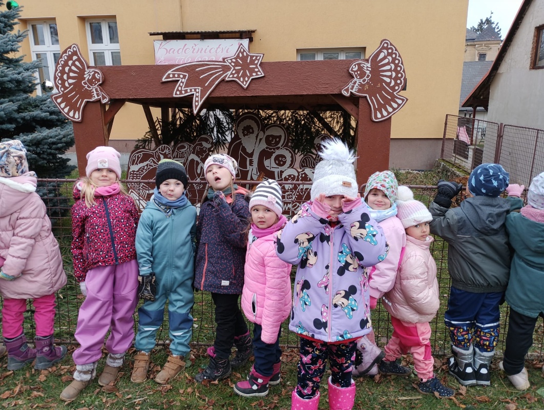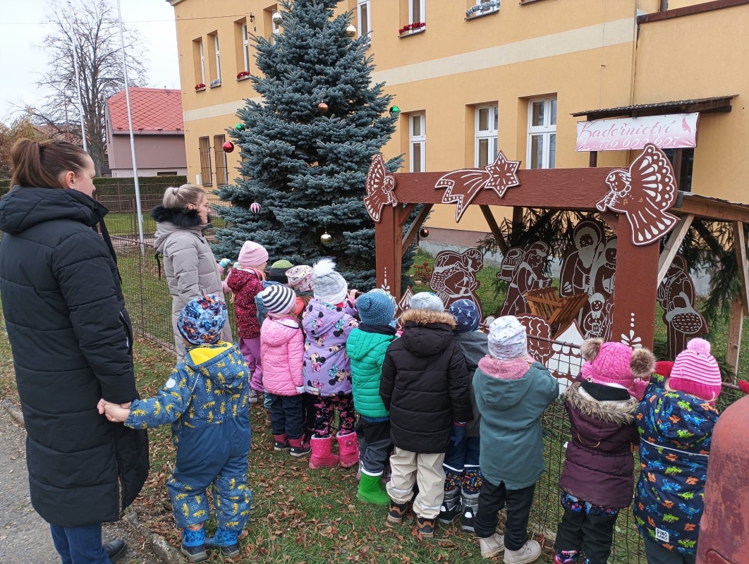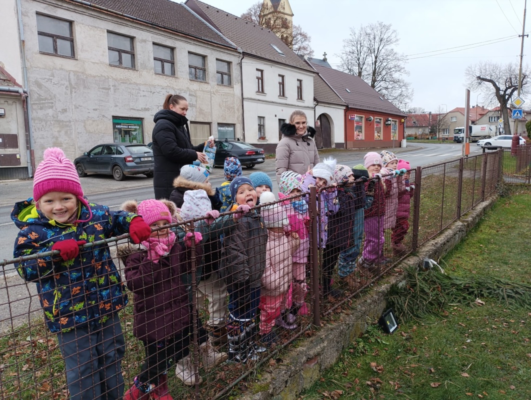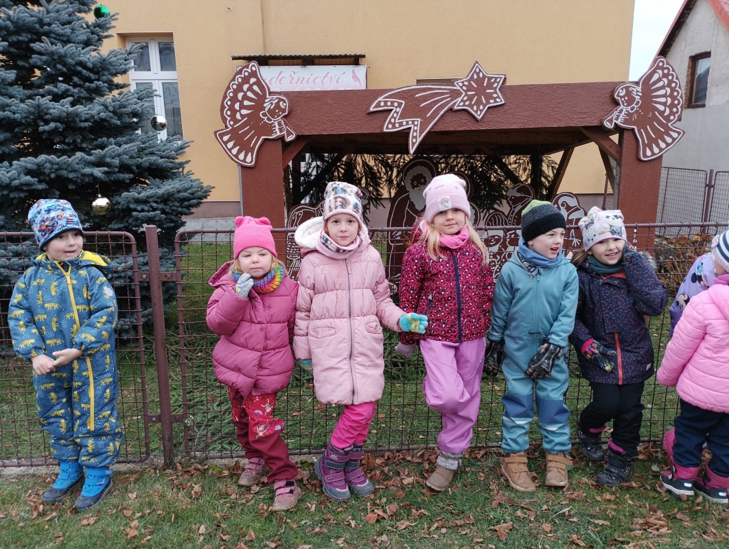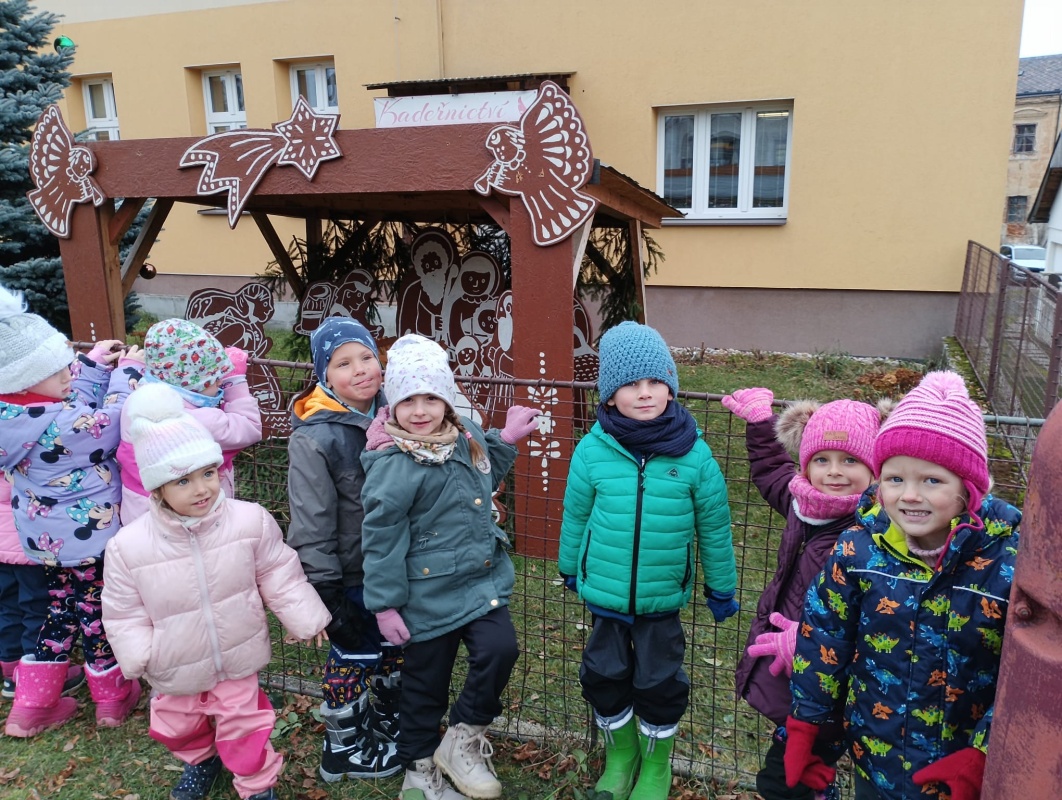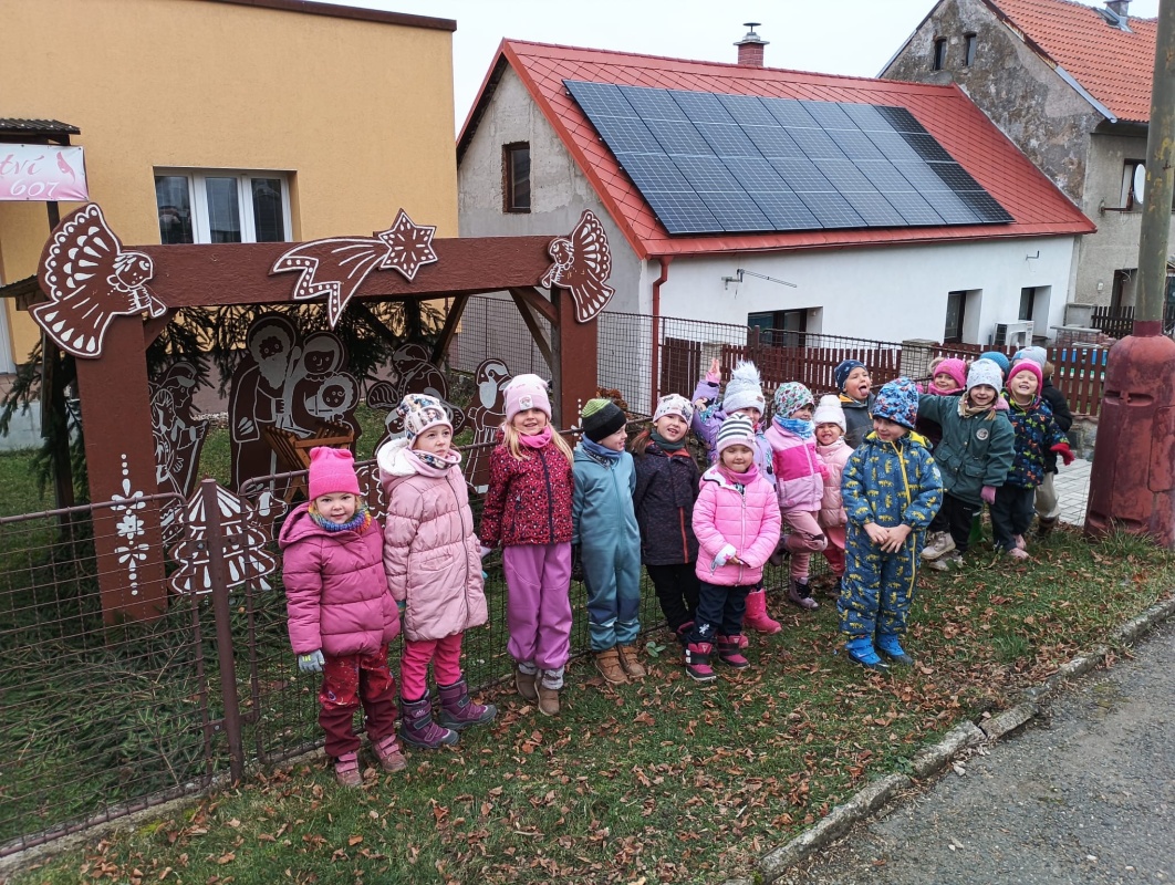 Na vycházce jsme prošli místa, která děti dobře znají – kostel, obchod, ordinaci doktora, zámek i obecní úřad, před kterým nás potěšil krásný betlém.