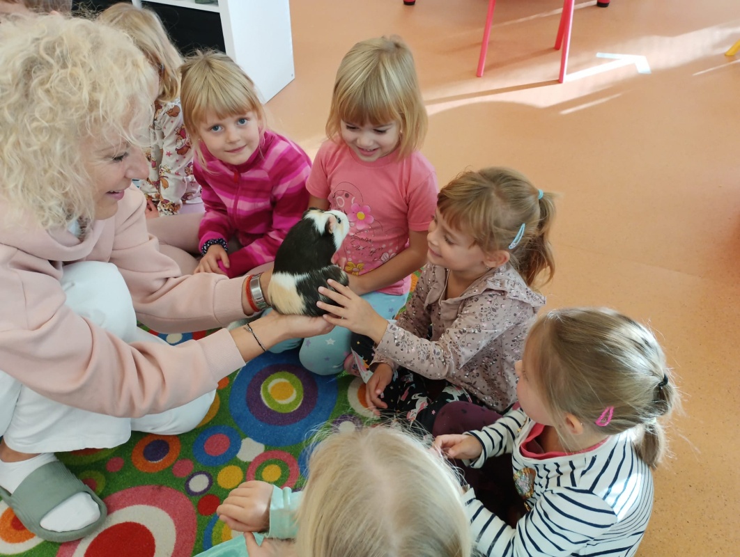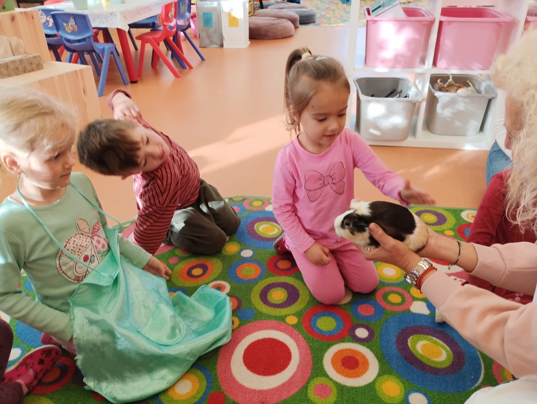 Velkým zážitkem pro všechny bylo i seznámení s naší novou kamarádkou – morčátkem, které se u nás hned zabydlelo. Děti se učily, jak se o něj starat, co má rádo a jak s ním zacházet s ohleduplností a láskou. Byl to krásný a veselý den plný podzimních zážitků!