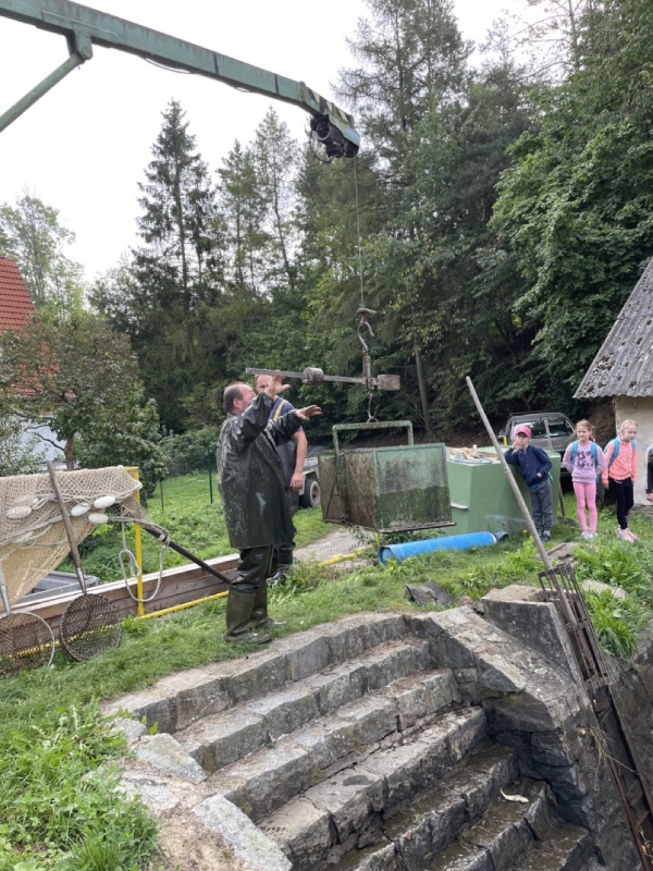 Hned jsme viděli, jak to chodí, když si pro ryby přijede zákazník. V kádi se v okamžiku objevili sumci, štiky a také kapři. Byla to rychlost! A my jsme pozorovali práci pana Víty. Vypouštění sádky, odlovení ryb, vážení, nakládku ryb, napouštění sádky.....