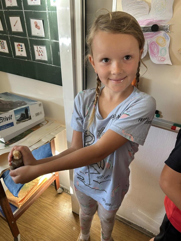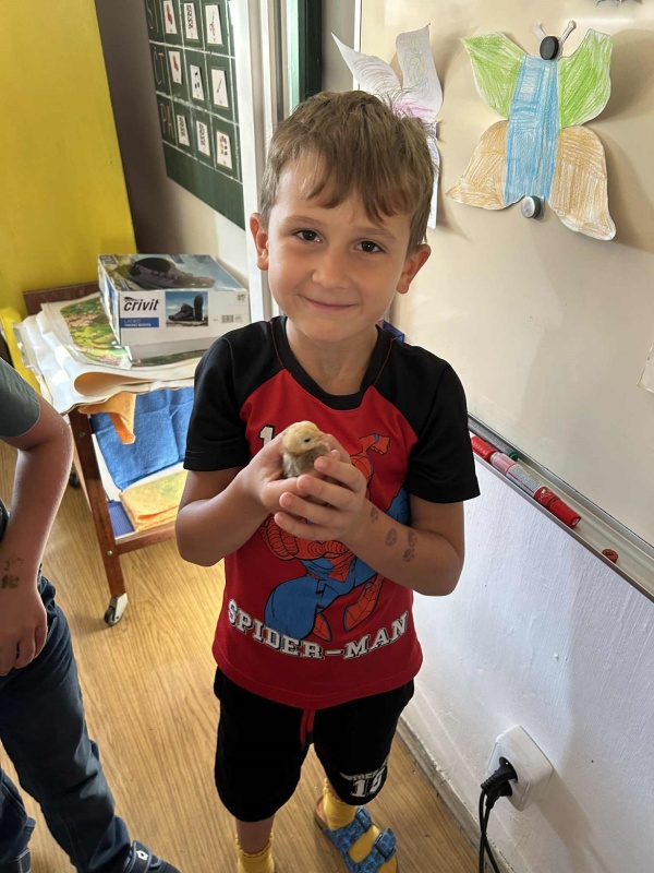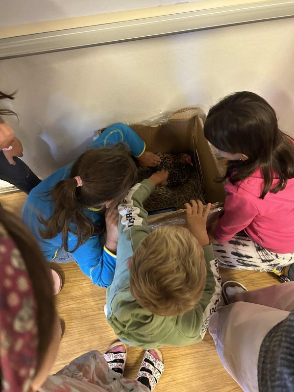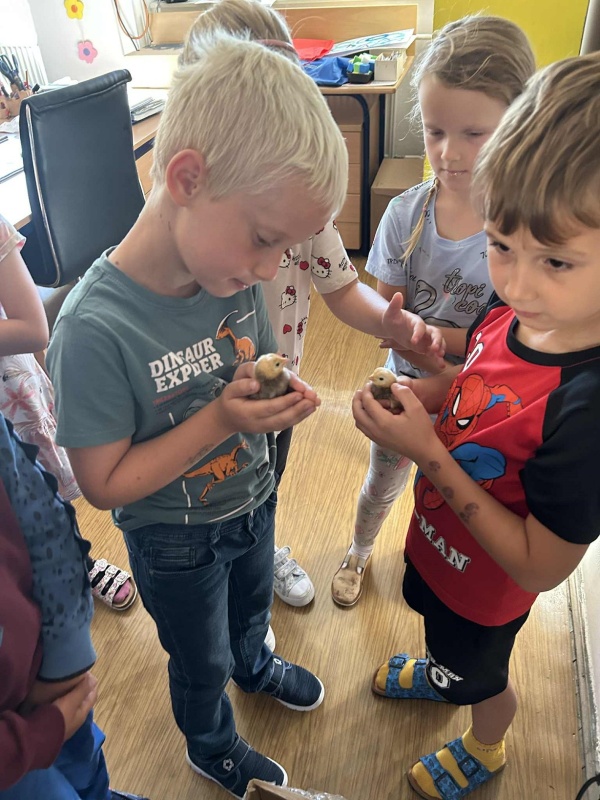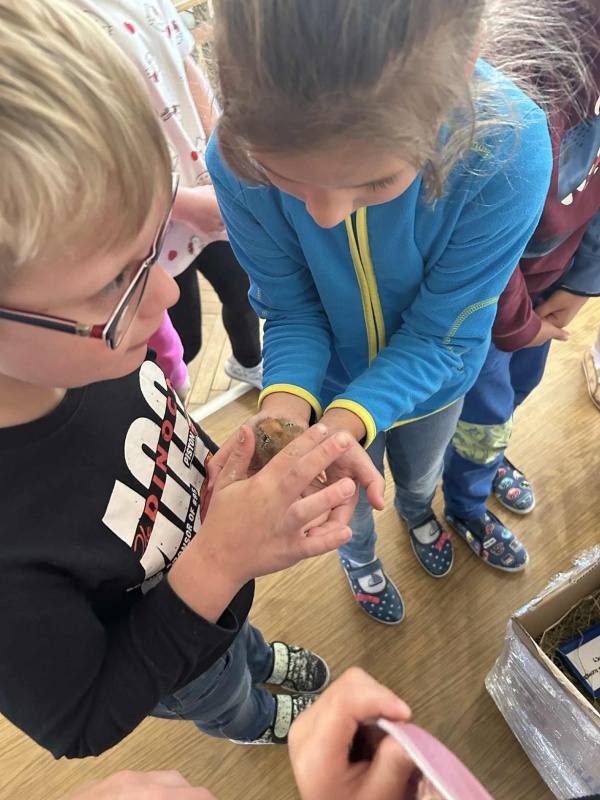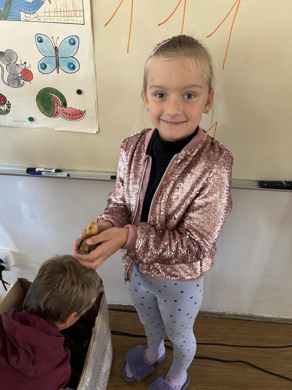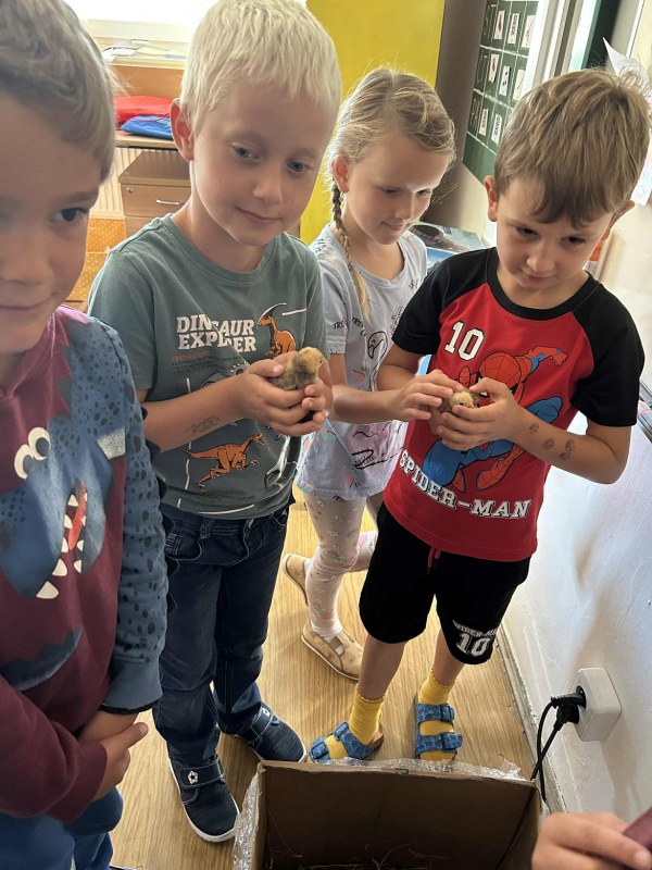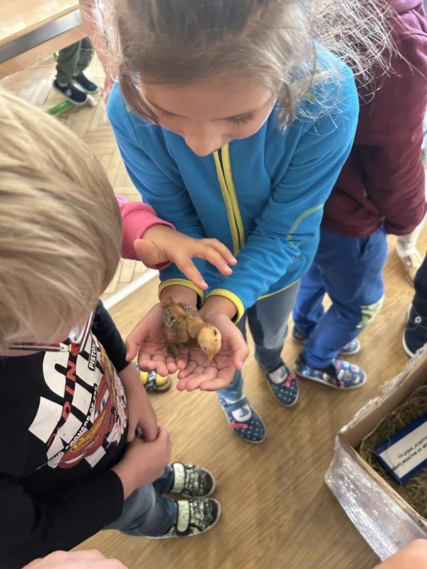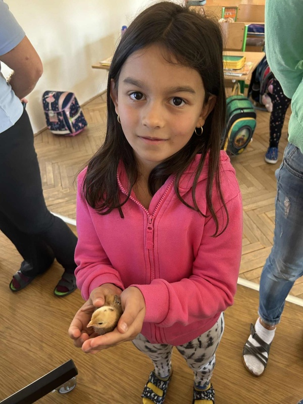 Školní rok se rozjíždí, zase jsme všichni spolu, zasedli jsme do lavic. A právě z lavic nás ve středu zvedla vzácná návštěva. Druhačka Jasmínka nám přinesla ukázat svou slepičku i s kuřátky.